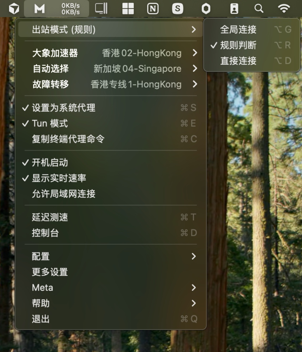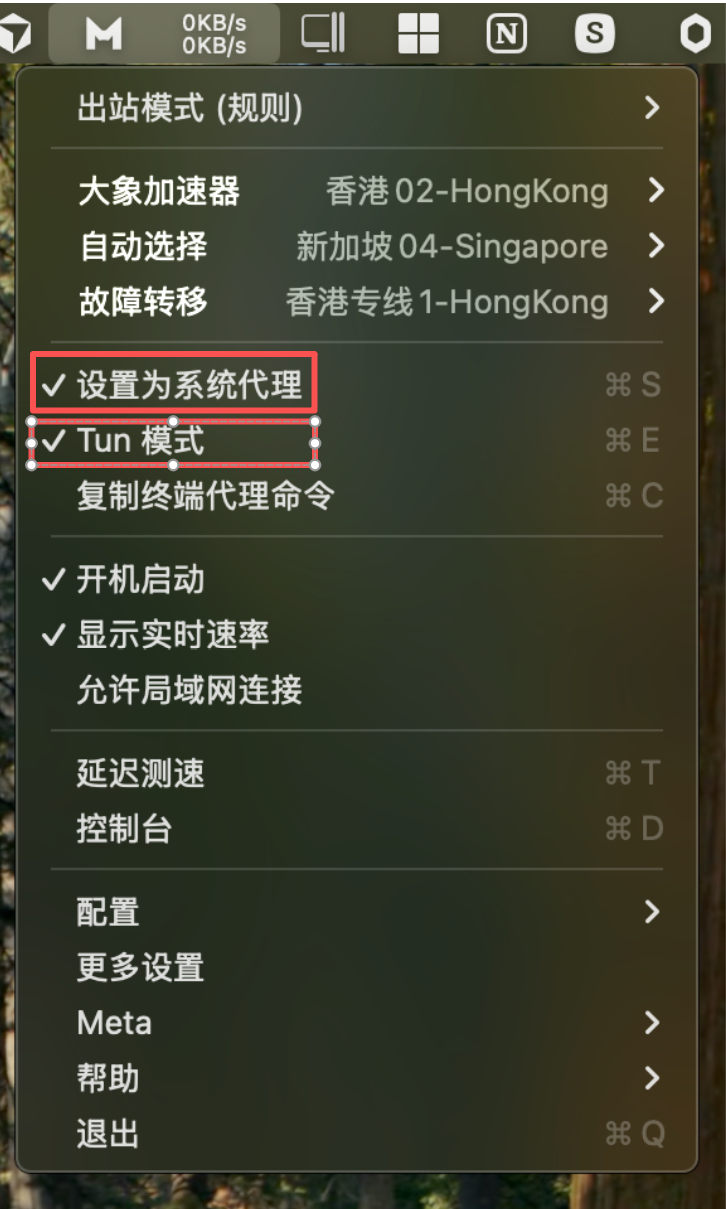 1、点击状态栏中的小猫咪软件图标,打开【主菜单】 ->【设置为系统代理】和【tun模式】,即可启动软件代理,启动后【设置为系统代理】和【tun模式】前会出现【√】如下图所示。