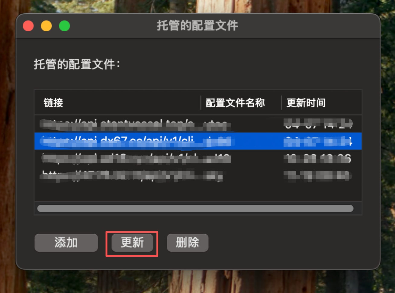 1、如果发现某些线路无法使用,点击状态栏中的小猫咪软件图标,打开【主菜单】 -> 【配置】 -> 【托管配置】 -> 【管理】->刷新(这相当于重新刷新线路节点信息),如下图所示