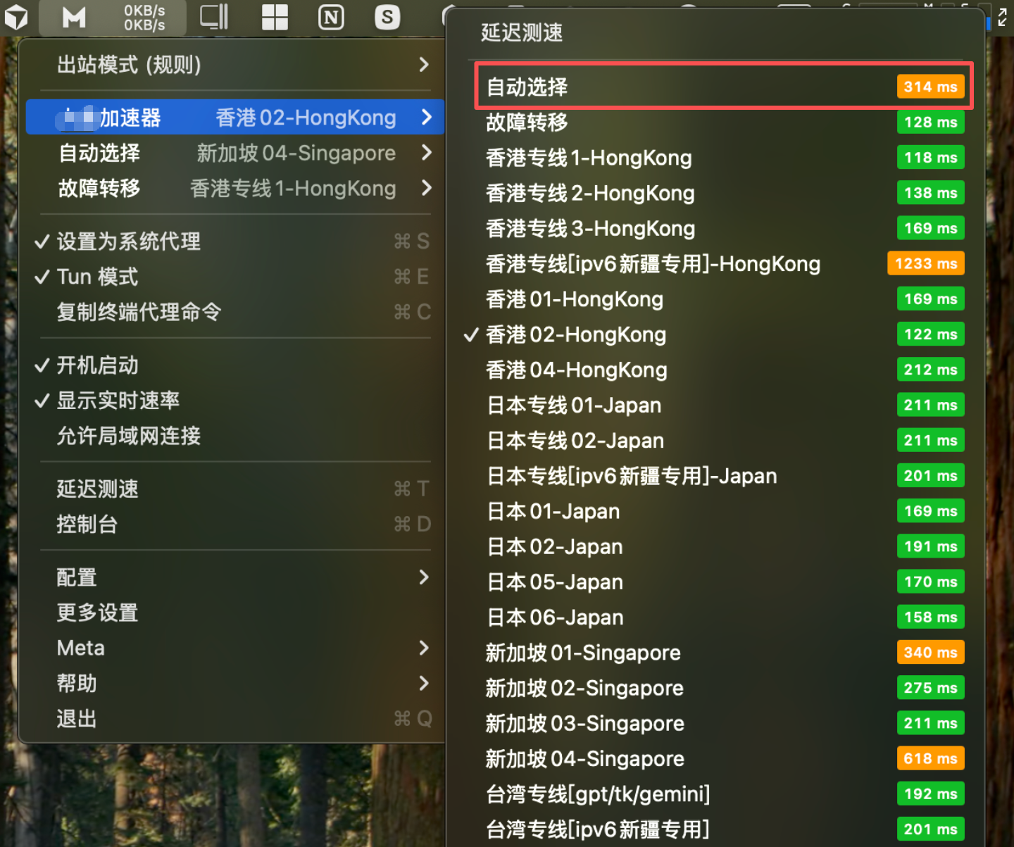 1、点击状态栏中的小猫咪软件图标,打开【主菜单】可以看到出站模式下有线路选择等选项,选择任意节点即可选择系统代理,建议选择"自动选择",如下图所示