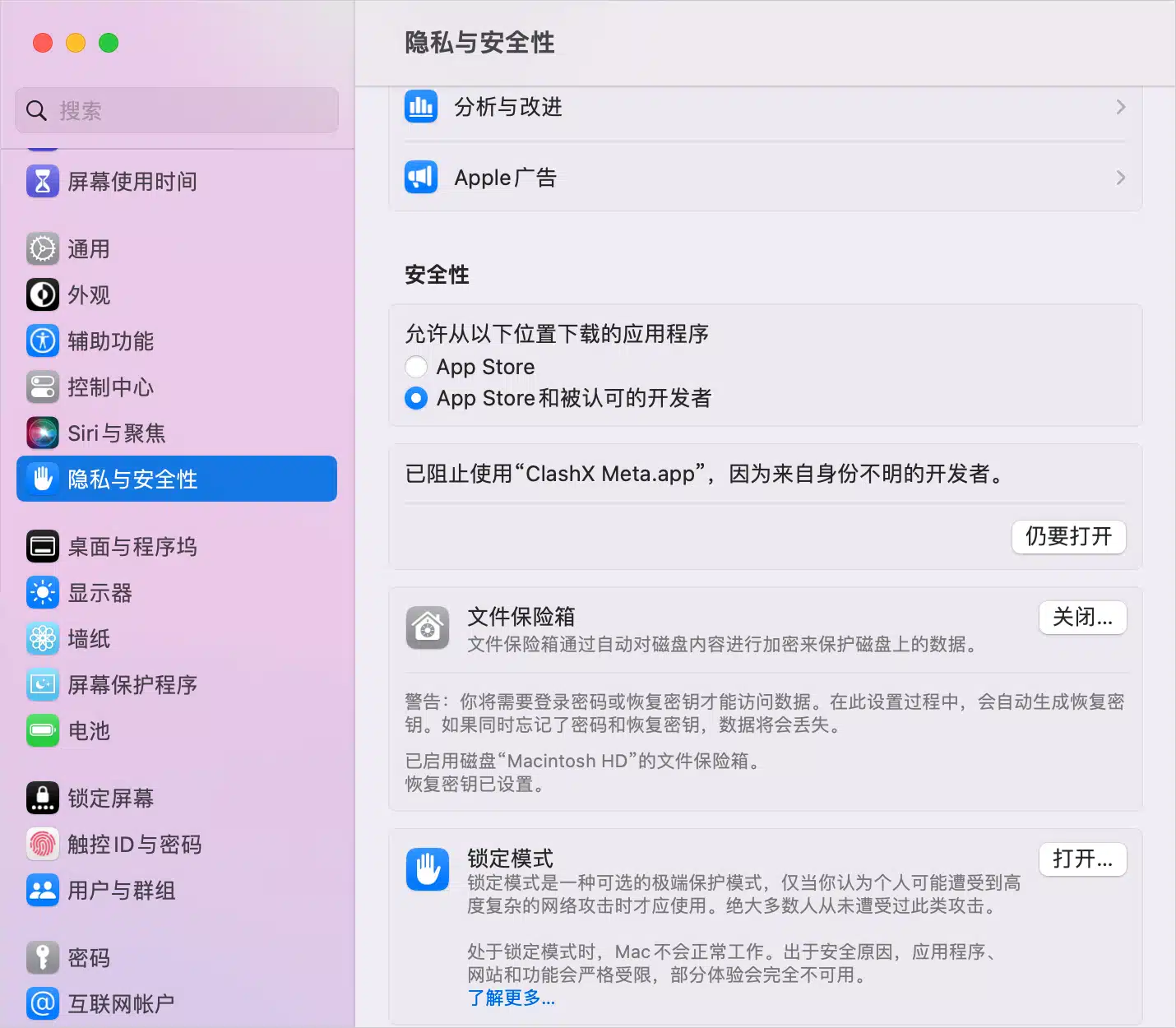 3.2、点击控制台的系统设置,找到隐私与安全性,可以发现已阻止使用“ClashX Meta.app”,因为来自身份不明的开发者。提示,点击仍要打开,接下来输入系统密码即可,如下图所示。