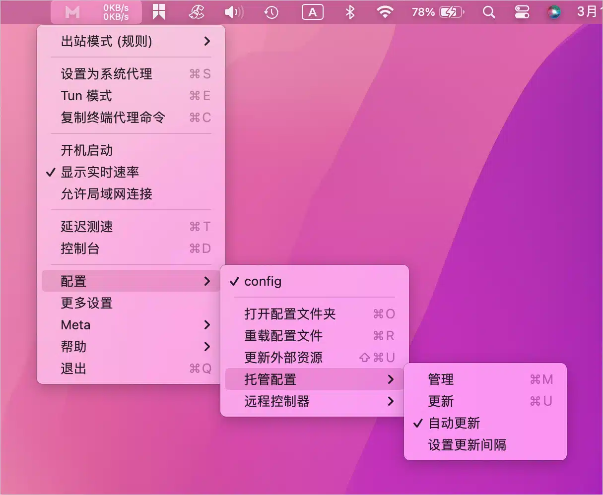 2、启动ClashX Meta软件,点击状态栏中的小猫咪软件图标,打开【主菜单】 -> 【配置】 -> 【托管配置】 -> 【管理】,如下图所示。